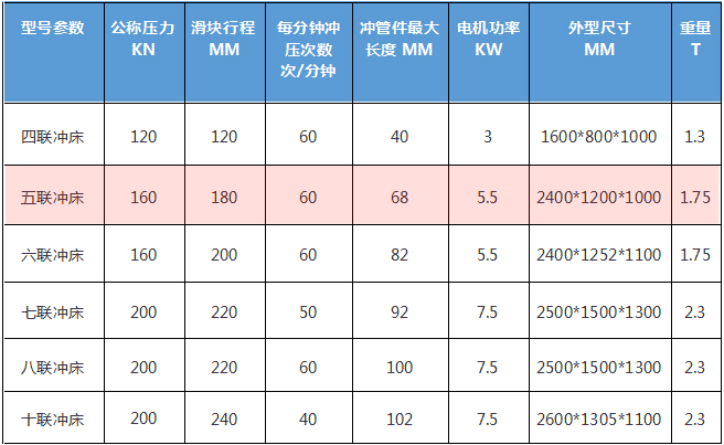 五聯式沖床基本參數: